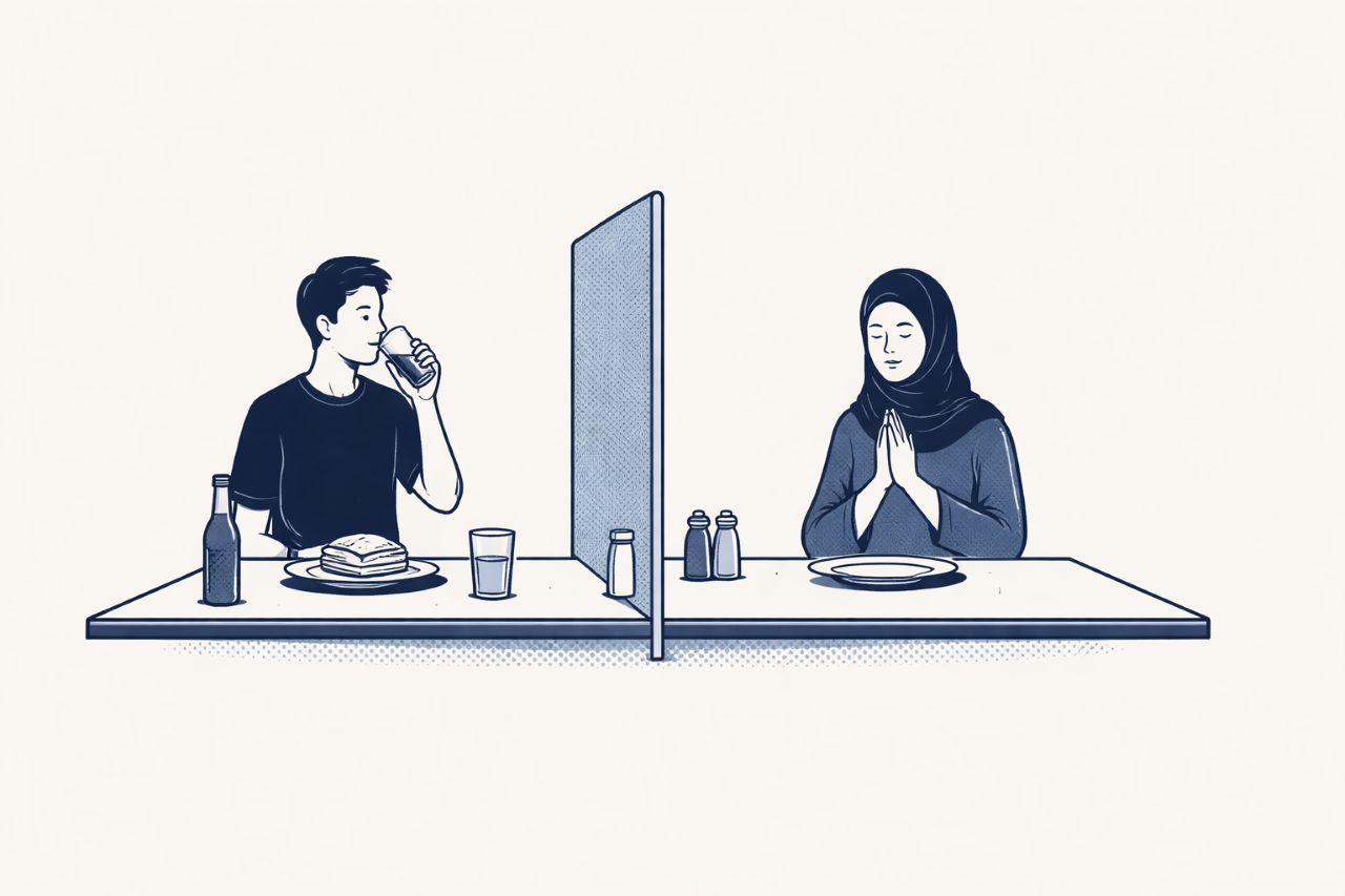 Bayangkan suatu ketika Anda duduk dalam sebuha kendaraan umum. Penumpang di dekat Anda tidak puasa. Ia makan makanan kecil, minum dan merokok. Apa perasaan Anda yang sedang puasa? Bila Anda merasa sedikit benci pada orang itu, Anda “normal.” Tetapi rasa benci Anda itu dapat menjadi penyebab batalnya puasa Anda hari itu. Karena itu hormatilah orang yang tidak puasa.